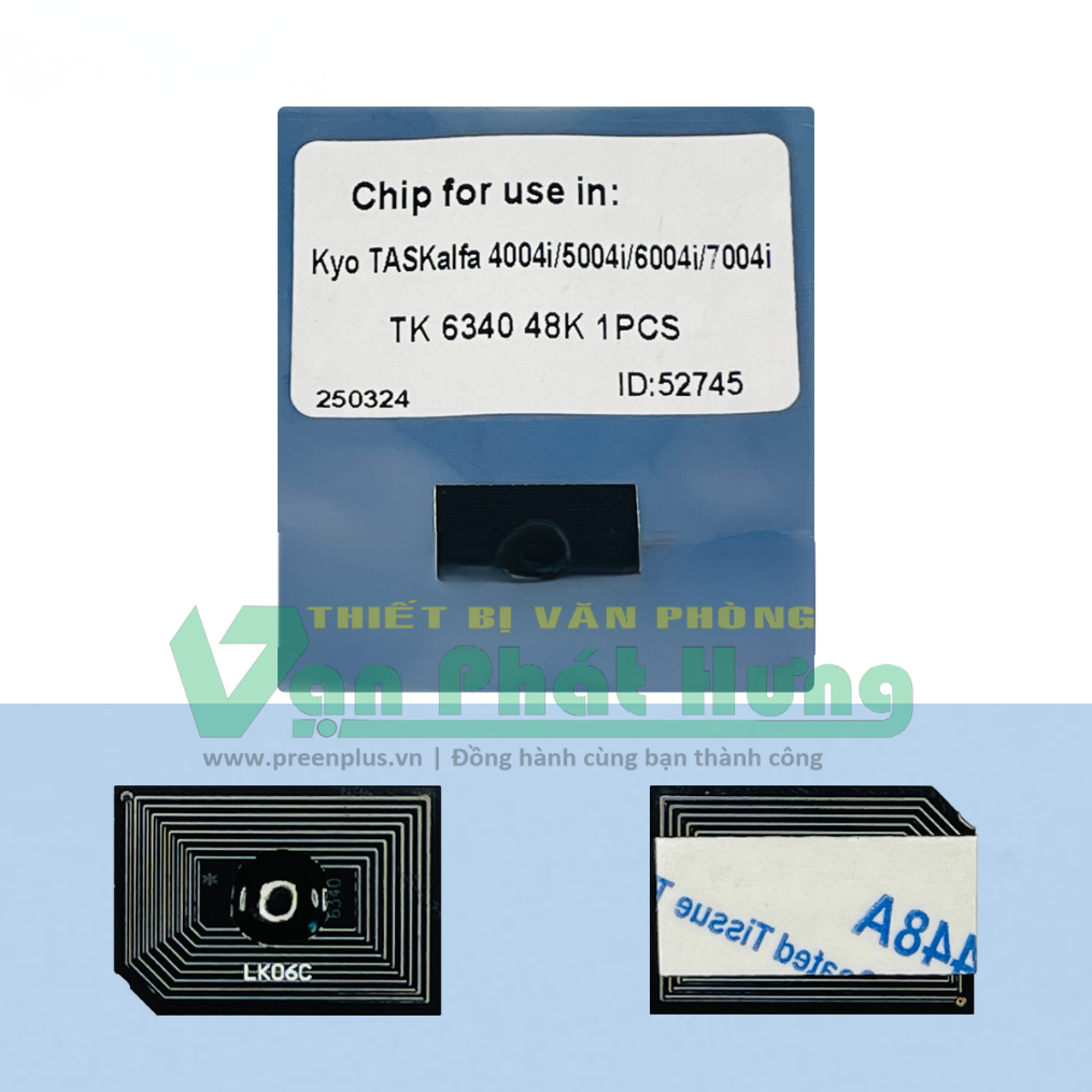 Chip Kyocera TASKalfa 5004i/6004i/7004i (TK-6340) là linh kiện dùng để reset bộ đếm mực trong hộp mực đen của máy photocopy Kyocera. Khi thay hộp mực mới, chip này giúp máy nhận diện chính xác dung lượng mực, đảm bảo in ấn liên tục, không bị gián đoạn bởi thông báo hết mực giả.